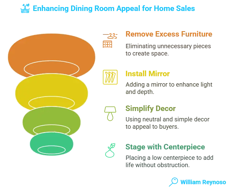 Many sellers overlook the dining room’s potential impact on home value. While ranked lower in buyer surveys, it significantly showcases the entertainment lifestyle buyers want. An adequately staged dining space can become a key selling feature.